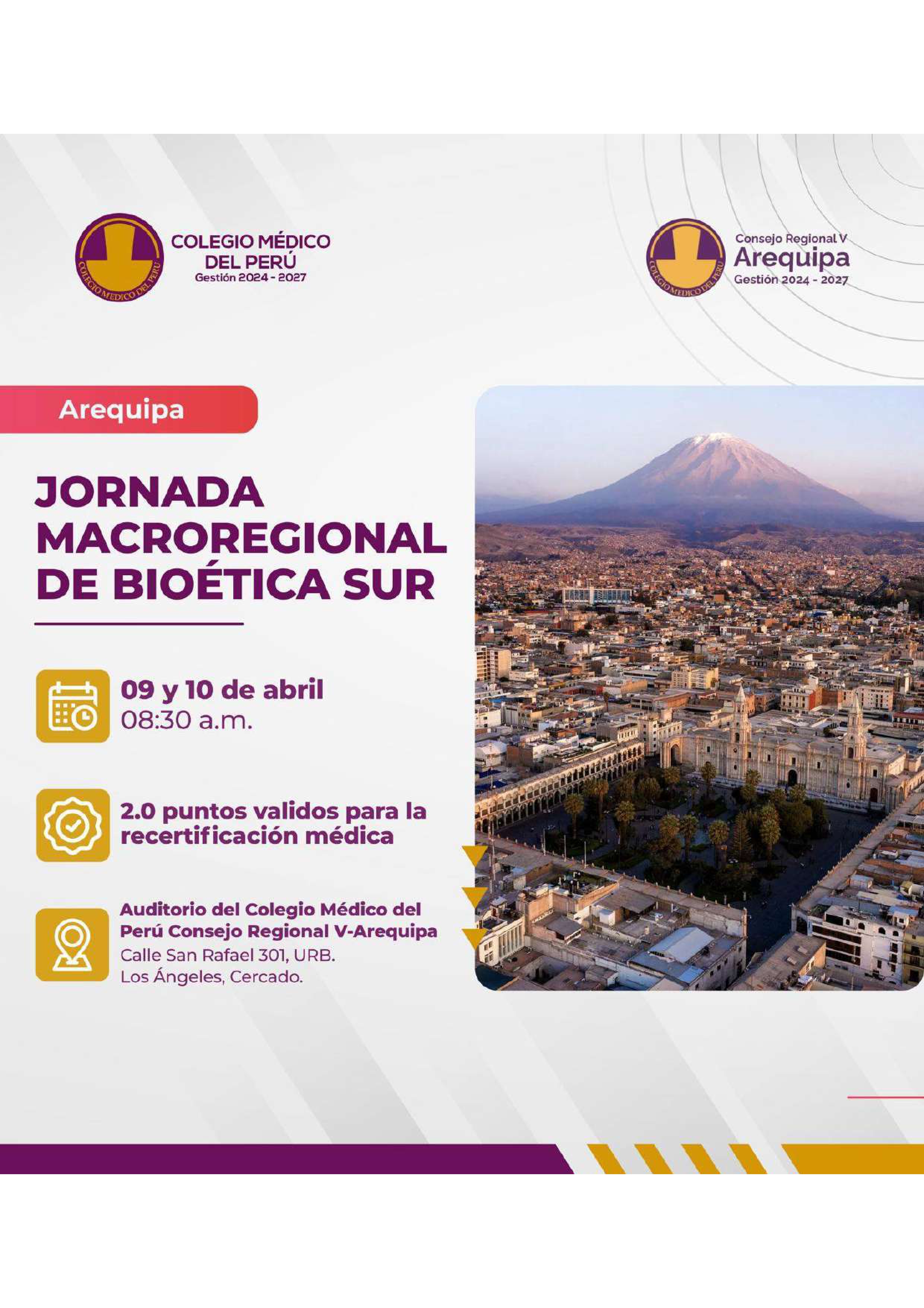 Usted está aquíInicio » JORNADA MACROREGIONAL DE BIOÉTICA SUR JORNADA MACROREGIONAL DE BIOÉTICA SUR Lugar: Auditorio del Colegio Médico del Perú - Consejo Regional V Arequipa.Fecha: Jueves, 9 Abril 2026 - 8:30amJORNADA MACROREGIONAL DE BIOÉTICA SUR.