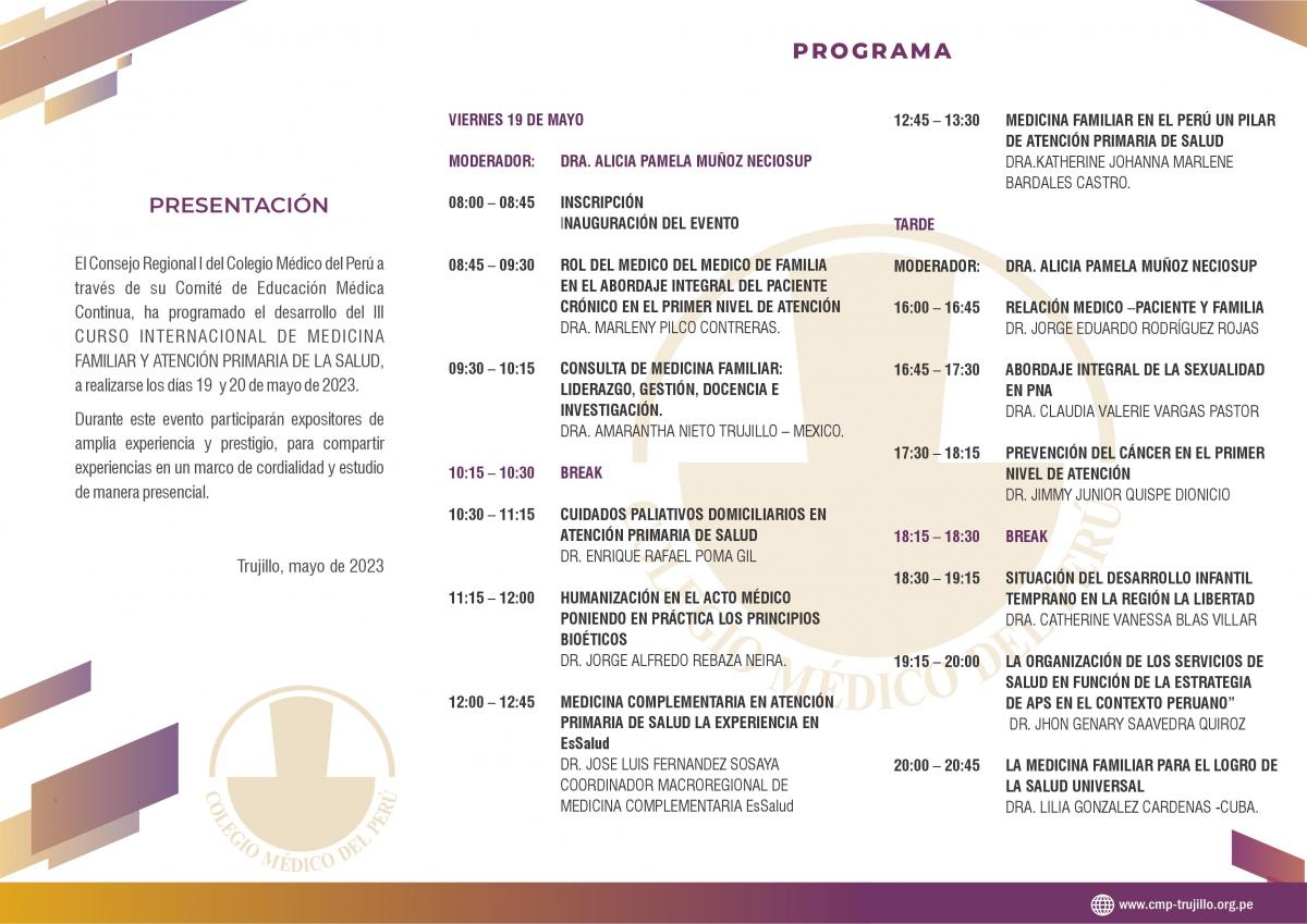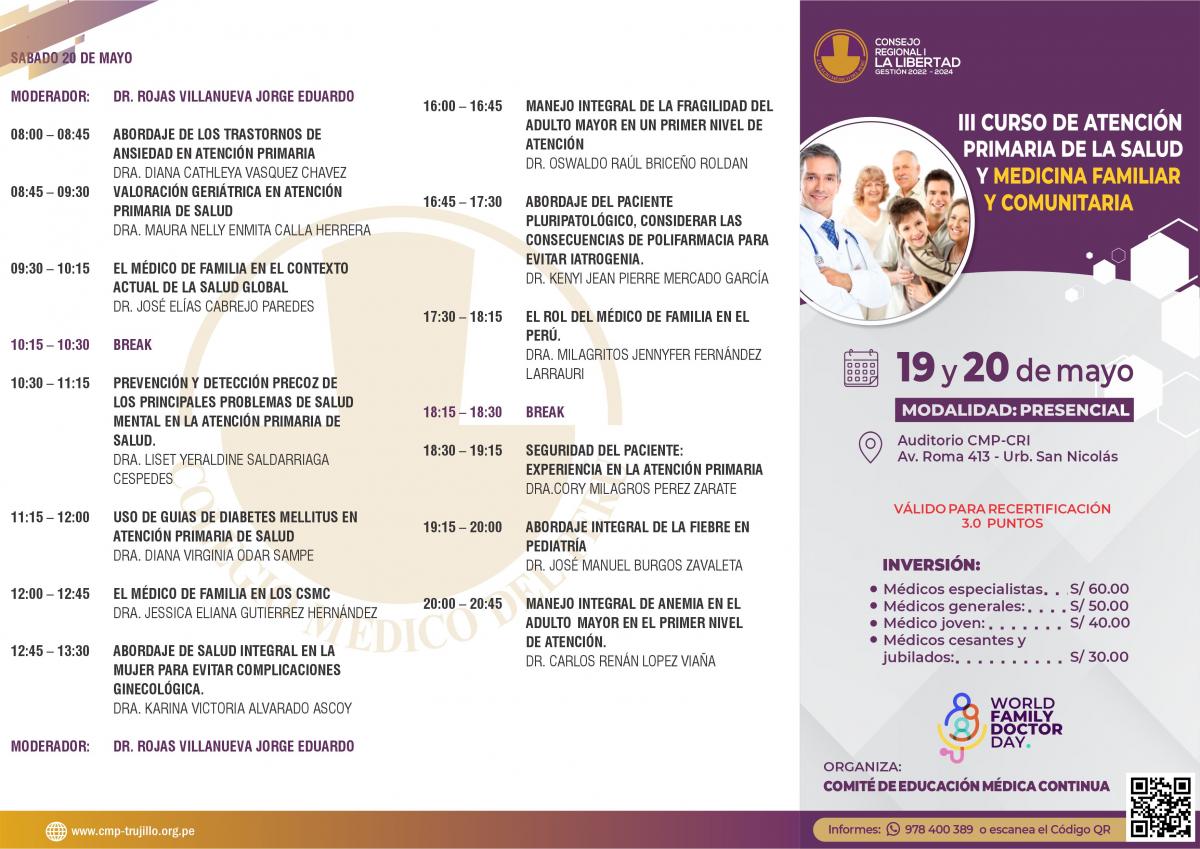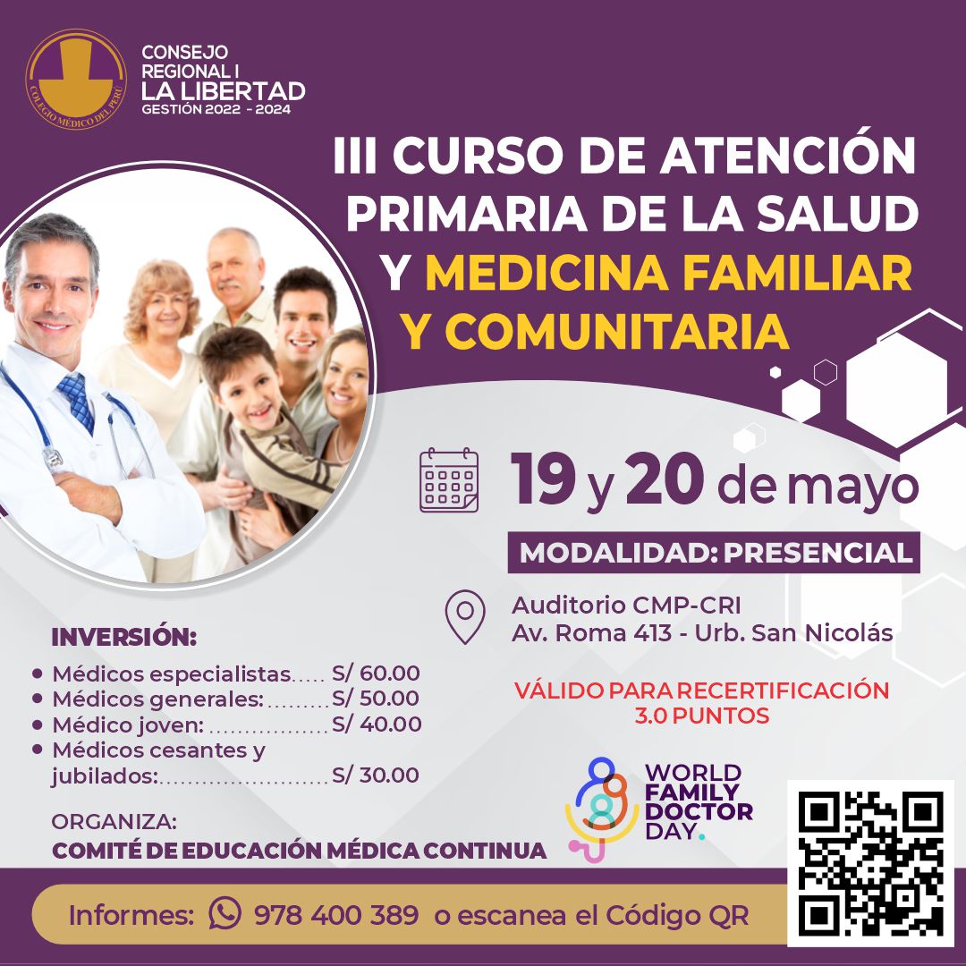 El CMP Consejo Regional I La Libertad a través del Comité de Educación Médica Continua, les comparte el programa del III Curso de Atención Primaria de la Salud y Medicina Familiar y Comunitaria (modalidad presencial).