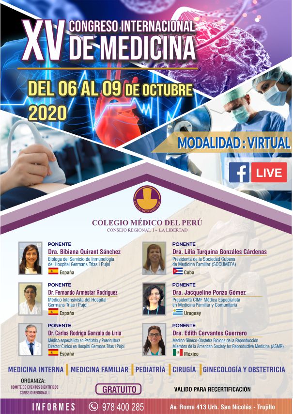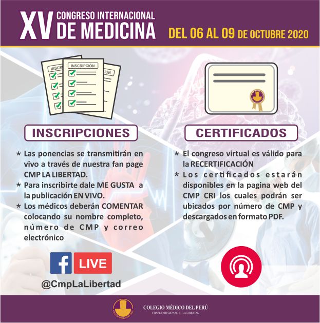 El Consejo Regional I del Colegio Médico del Perú, a través de su Comité de Eventos Científicos está organizando el XV CONGRESO INTERNACIONAL DE MEDICINA - VIRTUAL 2020