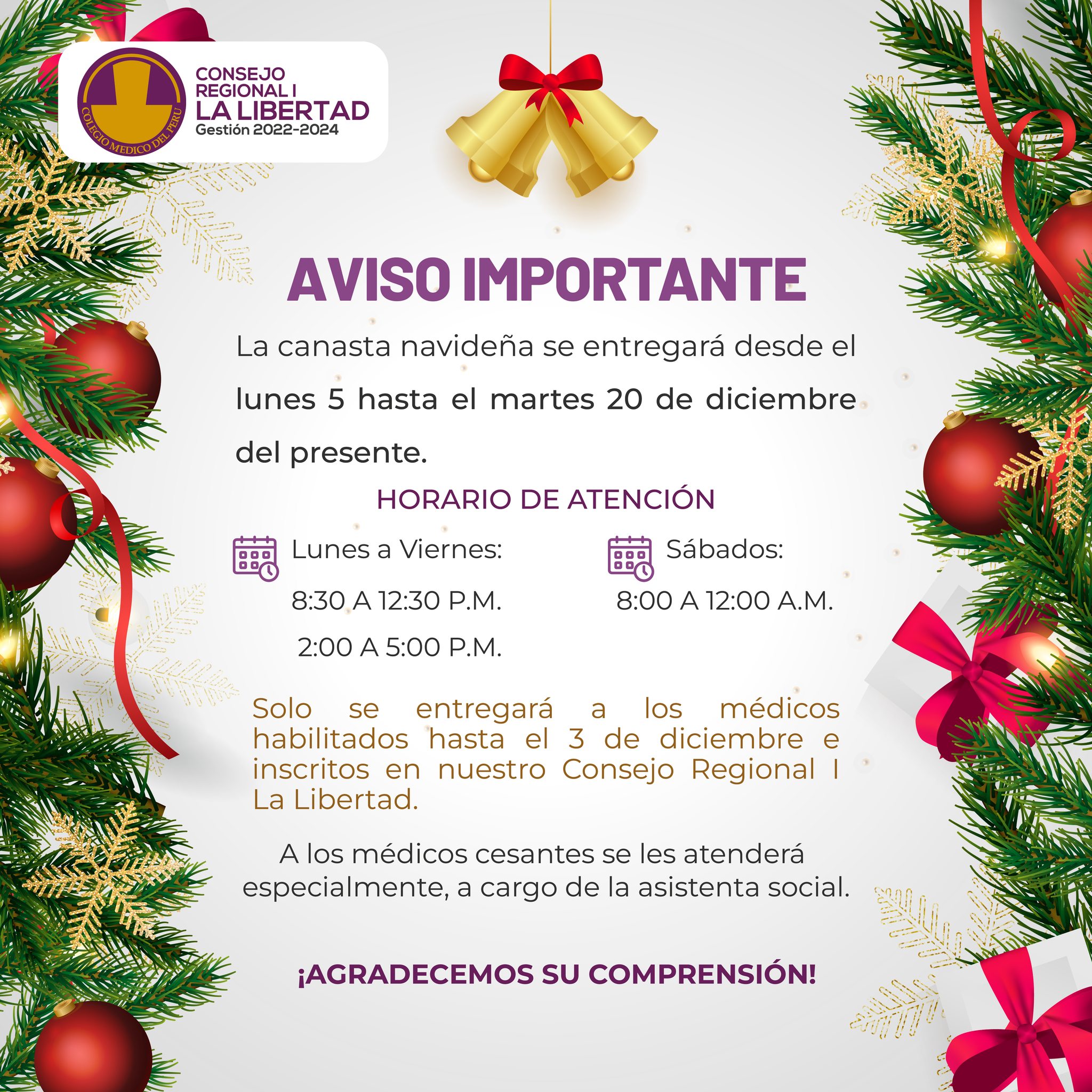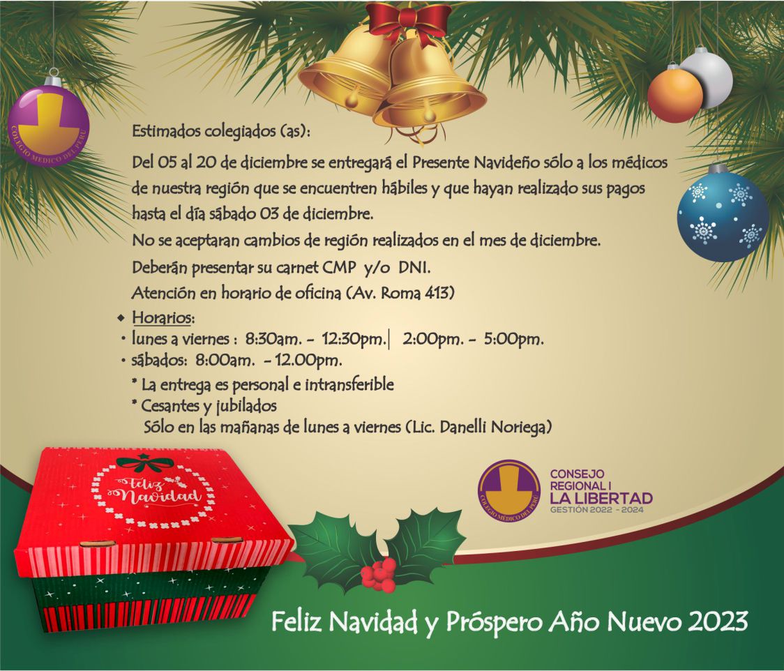 El CMP Consejo Regional I La Libertad comunica que la canasta navideña se entregará desde el lunes 5 de diciembre...