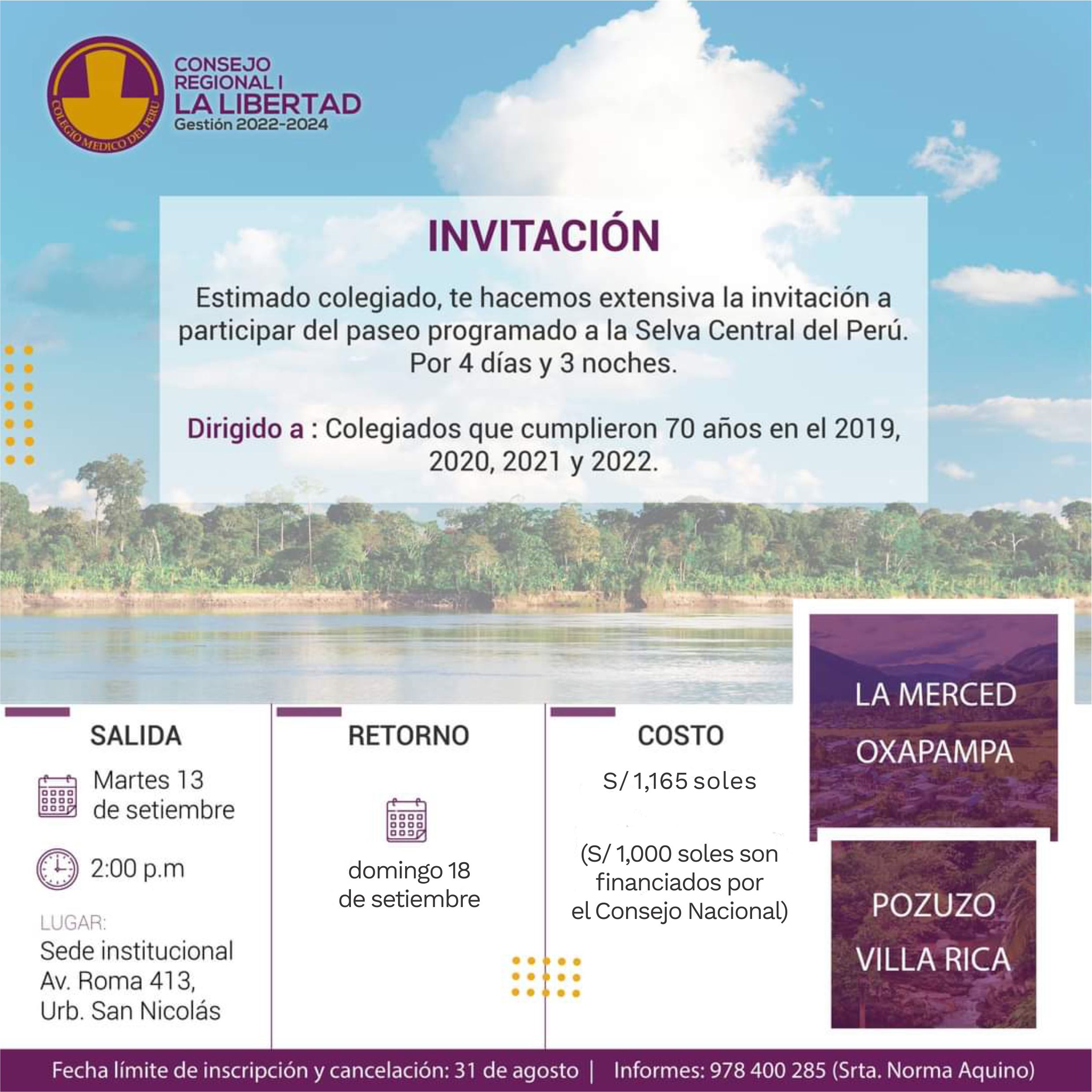 Estimado colegiado, te invitamos a participar en el paseo programado a nuestra Selva Central (La Merced, Oxapampa,...